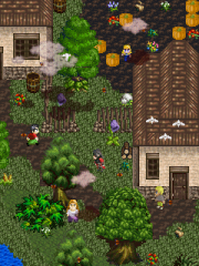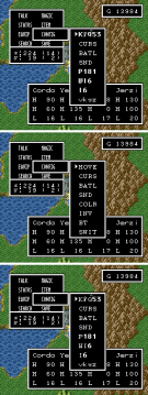 Vergleich der verschiedenen Übersetzungs-Versionen des RPG Maker 2, anhand des Ingame-Menüs. Oben: Letzter KanjiHack-Release (Version 0.9c) Mittig: Version 0.98 von MageCraft Unten: Im Internet kursierende "Version 1.05a" von MageCraft Abgebildetes Spiel: Honorable Direction 2: Enter Culex von Spoony Bard