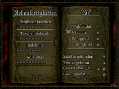 Im Inventar des Standardmenüs ist auch ein Notizblock aufrufbar, wo der Fortschritt zu den Nebenfertigkeiten "Schlösser knacken", "Taschendiebstahl", "Redekunst" und "Adlerauge" eingesehen werden kann. Zur Aufwertung dieser Fertigkeiten werden Bücher oder auch begabte Personen benötigt, die durch blaue Ausrufezeichen markiert wurden. Je höher diese Fertigkeiten ausgebaut wurden, desto größer ist die Chance, bestimmte Aktionen erfolgreich auszuführen.